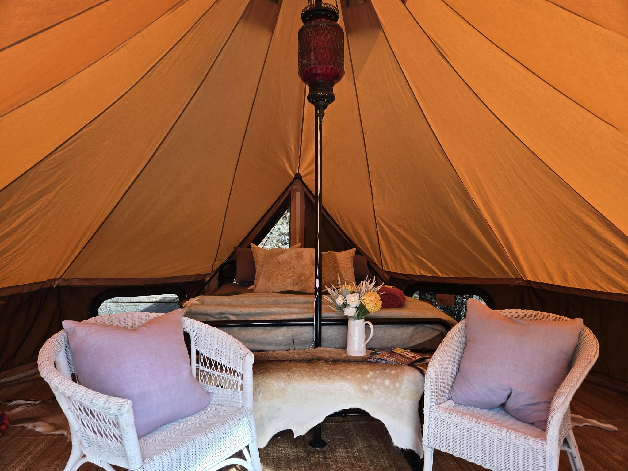 Our 5m Belle Tent is set up in a private, sheltered and peaceful clearing surrounded by trees on the 100-acre property. The tent is equipped with a queen-sized bed and all the creature comforts for luxurious glamping. Lay on the bed or laze on the couch and admire the stunning vistas overlooking the valley.